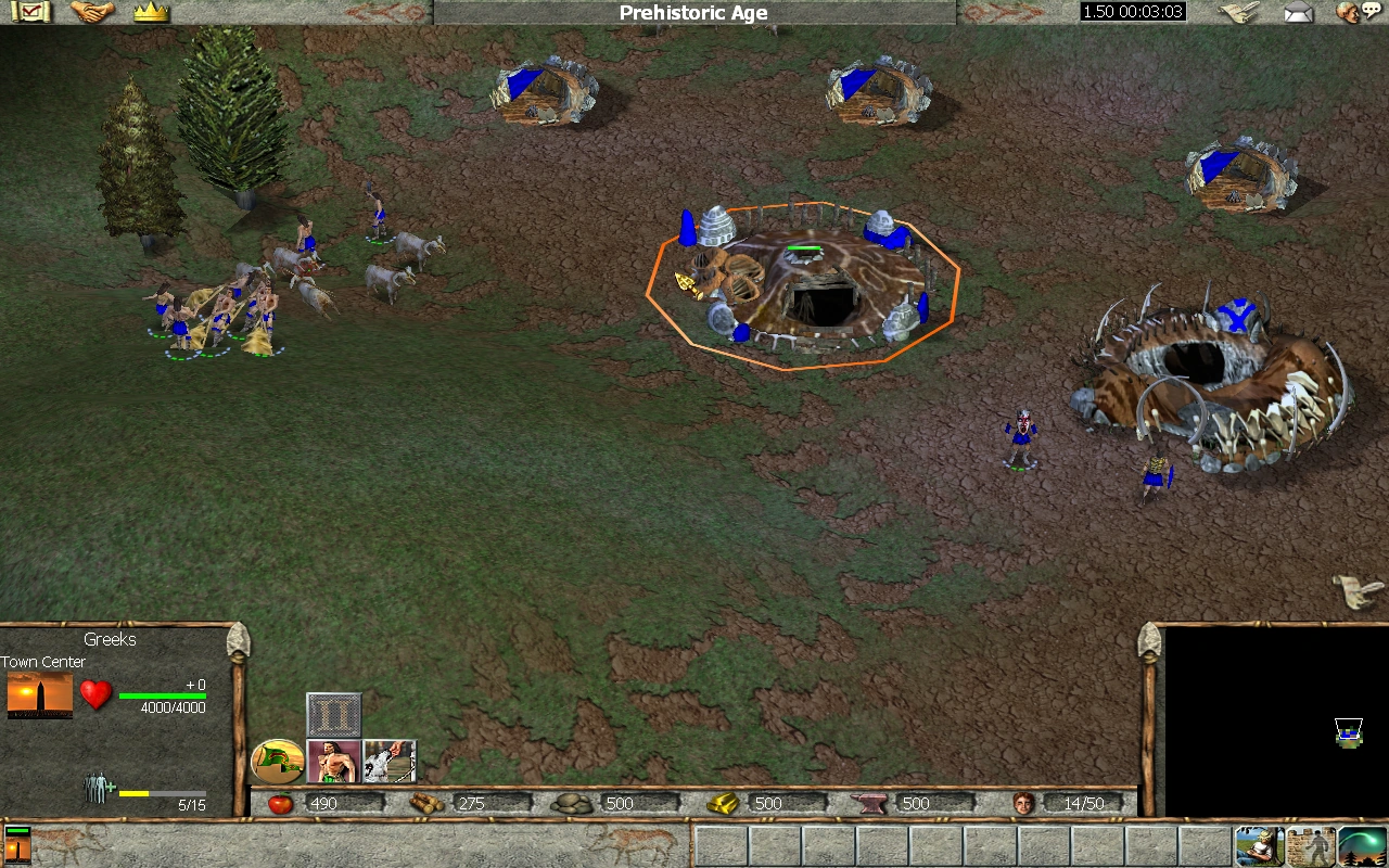 Once you have collected 750 units of food, advance to the Stone Age. If all goats near the [[Town Center (Empire Earth)|]] have been killed, you can find two small flocks of goats in the forest north of your village and another flock to the south east. Another flock can be found in the resource patch, where you "parked" Hierakles and his Clubmen. After the Stone Age has been reached, train a few more Citizens had have them harvest gold and iron. Three for each patch should suffice, if you're not in a hurry. Use the Gold and the Iron to build seven to ten Spearmen and three Sampsons. Collect more Iron and Gold to upgrade your units - hitpoint, attack and armor upgrades for the infantry units. You may want to upgrade the Sampsons' speed, so that they won't lag behind the rest of your army, when approaching enemy territory.