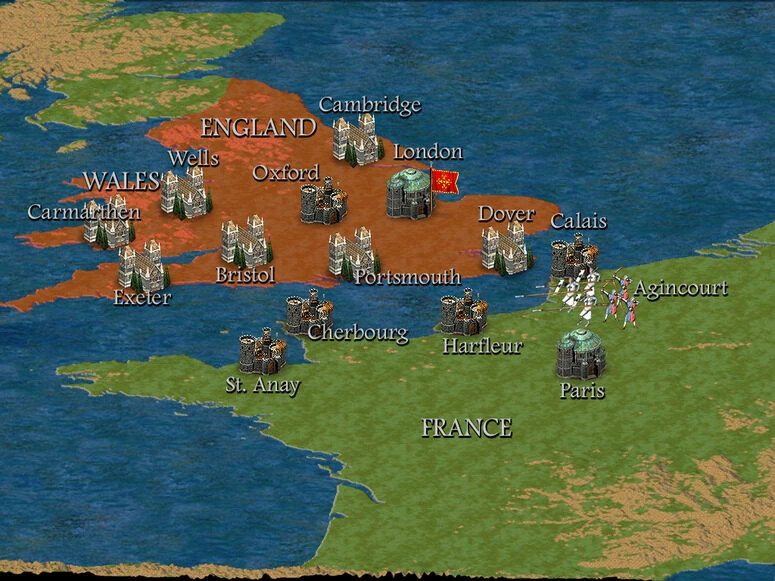 Battle of Agincourt: You lose control of your army for a short while. Send your two heroes to the ford in the far east of the map for reconnaissance. After a dialogue - citing Shakespeare's play Henry V - you regain control of your army. The following battle will be one of the easiest in the game. It has three phases:
